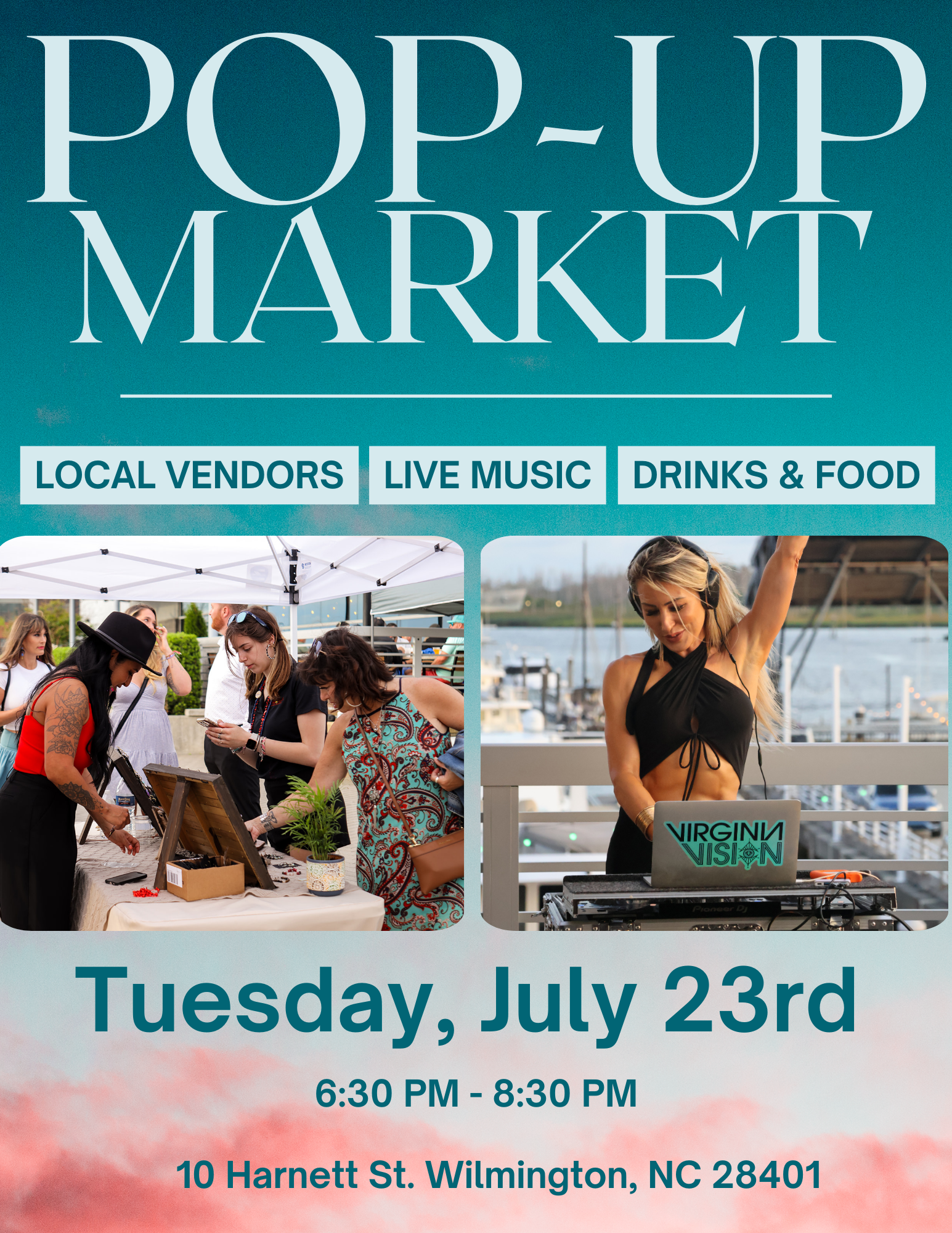 Join us at The Marina District on 7/23 for 15+ local vendors, $2 tacos, and DJ Virginia Vision spinning beats!