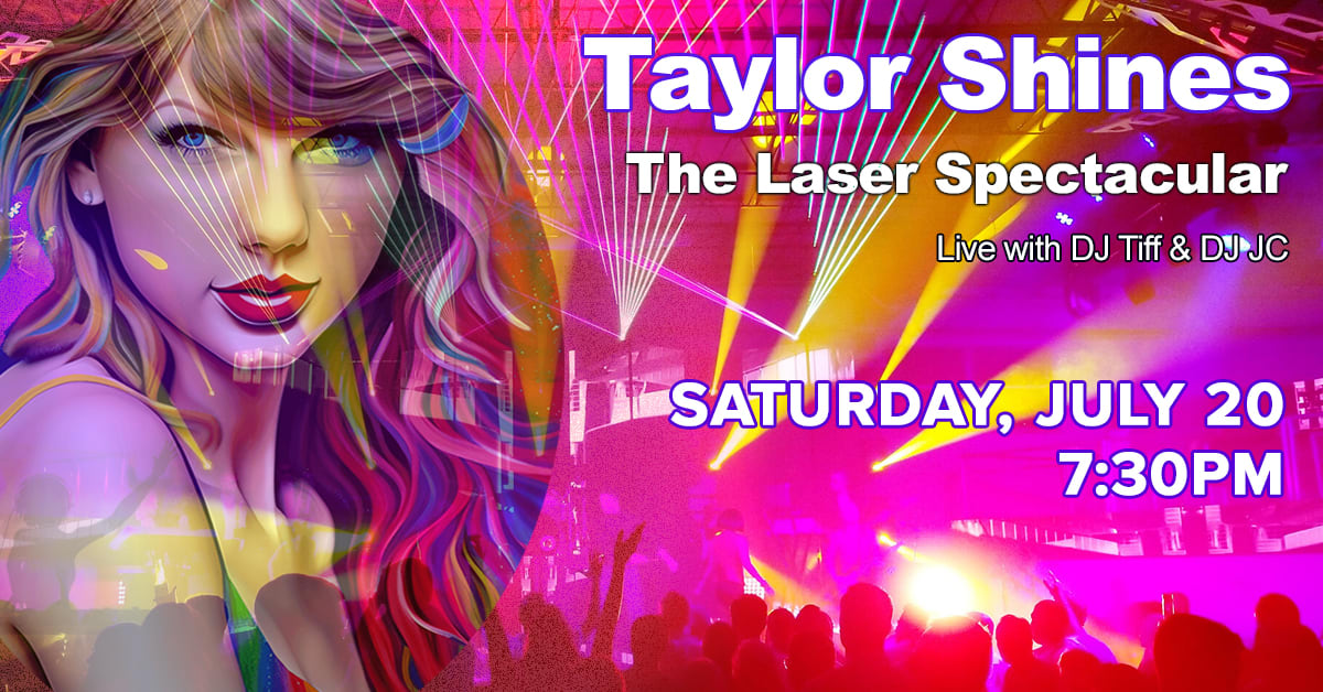 Taylor Shines: The Laser Spectacular, hosted by our electrifying DJs, is taking America by storm in 2024. It’s two hours of non-stop Taylor Swift hits seamlessly blended with the world-famous touring Laser Spectacular & Light show! The show also features large-screen video projection, 3-D glasses, and all the mind-bending effects the Laser Spectacular is famous for. DJ Tiff is an extraordinary on-stage presence that has the Swifties singing along with their favorite Taylor Swift hits. Joined by DJ JC, the two performers propel Taylor Shines to a thoroughly enjoyable evening for moms, dads, and all the Swifties in the family.