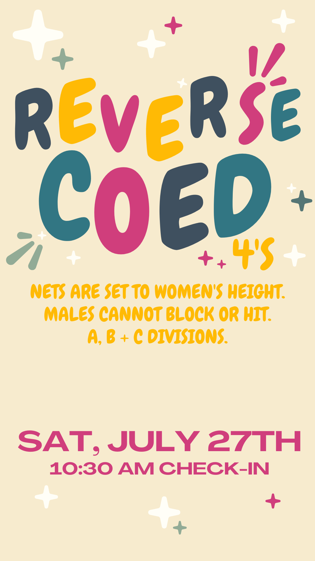 Check-in at 10:30am. Co-ed 4's. Team Registration: $40. A, B, C/Just 4 Fun divisions are offered. Prizes for division winners! Format and rules: Nets are set to women's height. Males cannot block or hit down-balls (even if they are past the imaginary 10' line). 4 Players on a team. Jump serving is allowed. There will be three divisions: A, B, and C/Just 4 Fun. If you do not regularly play beach volleyball (weekly), we suggest you sign up for the C division: our JUST FOR FUN group (this division can be non-coed too)!