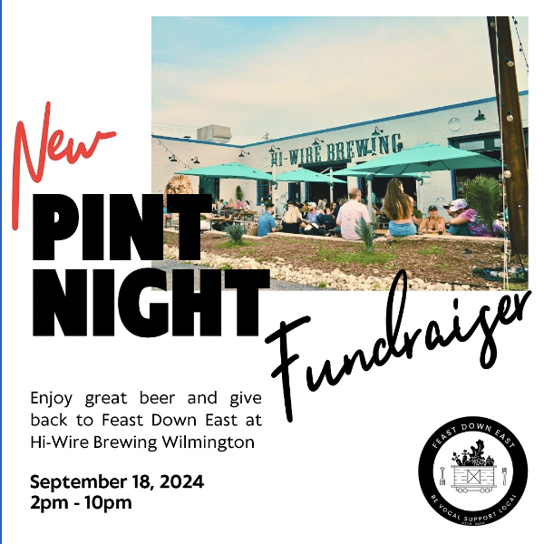 We are excited for a new Give Back Pint Night fundraiser with Hi-Wire Brewing Wilmington, on Wednesday September 18. 🍻 They will be generously donating $1 from every pint of their flagship beer sold to support our mission and work at Feast Down East. Help strengthen our local food system by stopping in and having a pint! 🍻