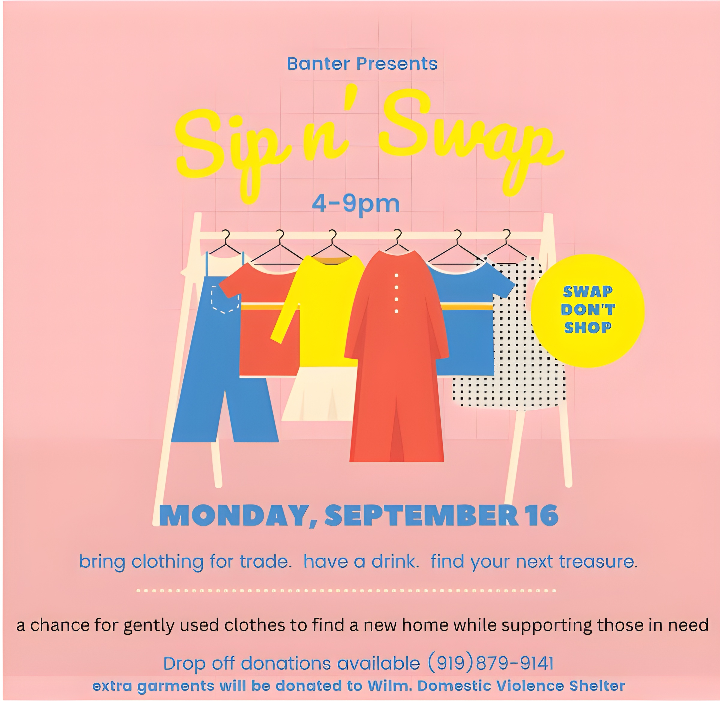 Bring clothes to trade, have a drink and find your next treasure! Extra garments will be donated to to Wilmington's Domestic Violence Shelter