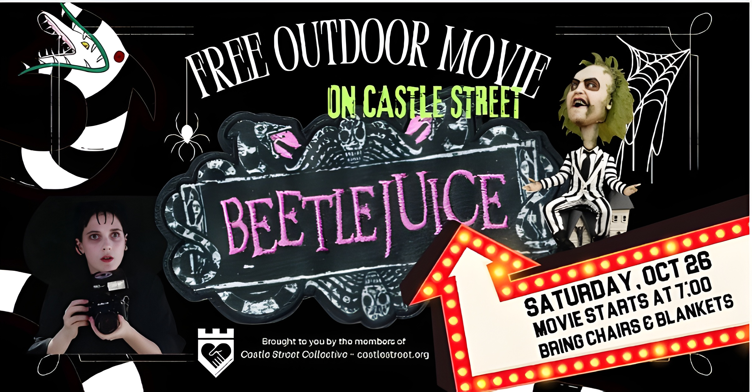 The ghost with the most will be the star of the show for our FREE Castle Street Movie Night October 26th at 6th & Castle! Free popcorn and refreshments will be provided. All you have to do is bring a chair, blanket, whatever you need to be cozy on a late October night. This could be the perfect occasion to break out that striped jacket and slip into a little Beetlejuice appropriate attire 😉
