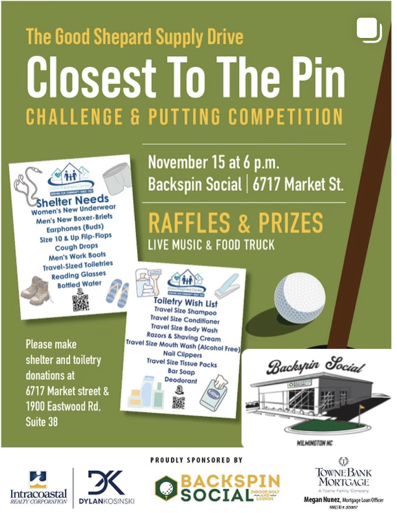 We are teaming up with @good_shepherd_center, @intracoastalrealty, @thedylankosinski and @townebankmtg to collect supplies needed at the shelter. We’ll be hosting a CLOSEST TO THE PIN & PUTTING CHALLENGE on Friday 11/15. Live music and food truck by @jamrock_foodtruck will all be there. Swing by @backspin.social with donations and get entered in the raffle for some great prizes! Hope to see you there!