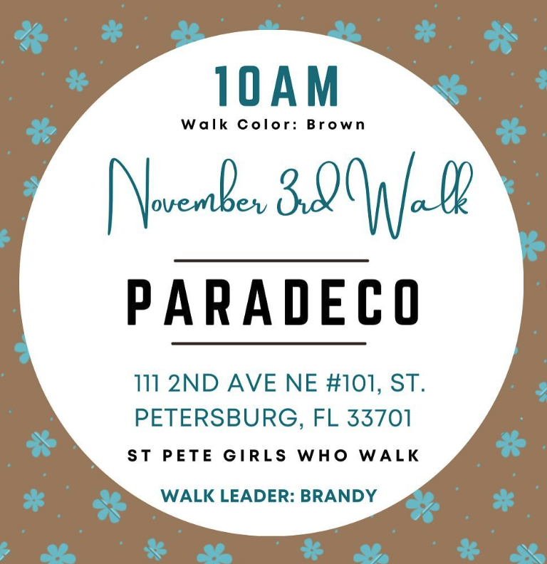 Looking to make new friends and enjoy the beautiful Florida sunshine? Come walk with us! We’re a friendly group of women who love to connect while exploring the scenic paths of St. Petersburg. Whether you’re a seasoned walker or just starting out, all are welcome! Walk color is brown.