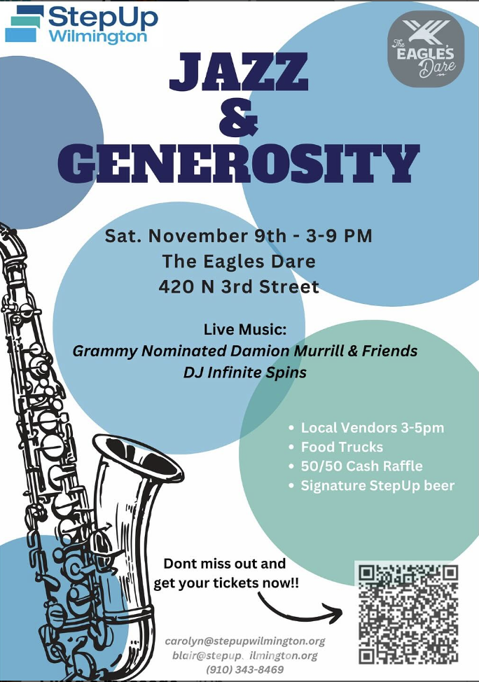 Welcome to StepUp Wilmington's Jazz and Generosity Night! Join us for a night of groovy tunes and giving back at The Eagle's Dare. Get ready to dance, enjoy food trucks, auction for exciting items, and support a great cause. Let's come together for an evening of music and making an impact in the community. Mark your calendars and get ready to StepUp for a night to remember!