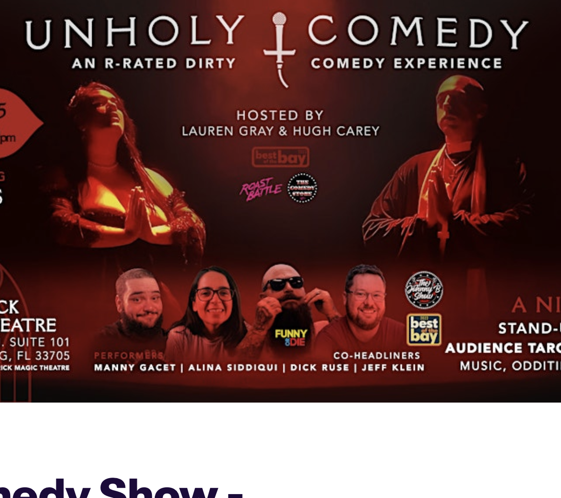 Unholy Comedy Show is an immersive night of R-rated stand-up comedy, audience tarot readings, music, and more. Winner of the 2023 Creative Loafing's Best Of The Bay's Critic's Choice award, Unholy Comedy Show's guests can expect hilarious R-rated stand-up comedy sets, devilish priests and nuns, and a dip into the occult as your hosts lightheartedly provide live audience tarot readings between comedy sets.