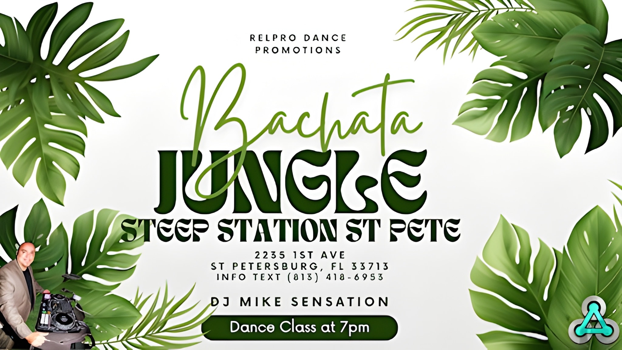 Welcome to the jungle, the Bachata Jungle at the unique Steep Station St Pete! You’ll love the rainforest decor with hammocks, tea on tap, kava and more! The floors are perfect for dancing! We will be playing 70/30 : bachata/salsa ! Bachata Class will be at 7pm! We then dance to the music of DJ Mike Sensation until midnight!