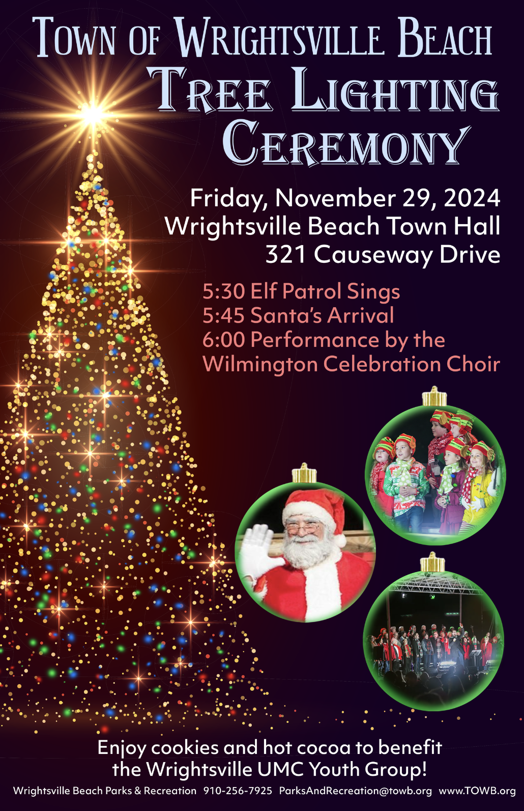 Kick off the Christmas season with the Town of Wrightsville Beach Annual Tree Lighting Ceremony. Hear the sweet sounds of the Performance Club's Elf Patrol as they set the stage for the Lighting of the Town's Christmas Tree welcoming the Jolly Old Elf himself. Enjoy the Christmas music, holiday lights and decorations, a cup of hot chocolate and cookies, and a visit with Santa.