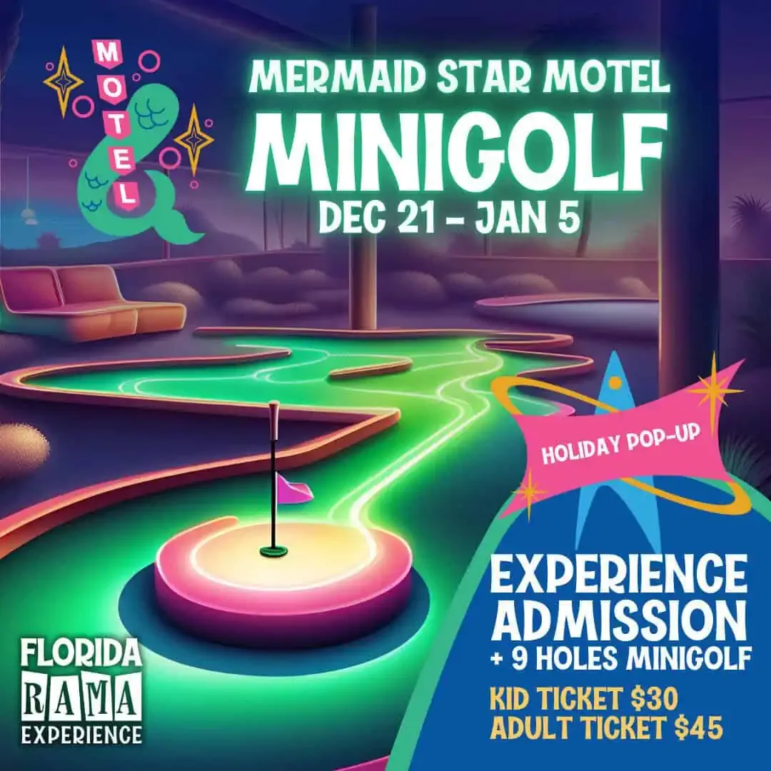 Elevate your FloridaRAMA visit with a round of neon minigolf while experiencing Unchant: Christmas with a Florida Twist! Ideal for holiday fun with family and friends, the Mermaid Star Motel Minigolf pop-up offers 9 unique holes inside the artist-made immersive experience. Available from Saturday, December 21 to Sunday, January 5, tickets are $13 per person, in addition to General Admission, and can be added to your cart when you buy your experience tickets online.