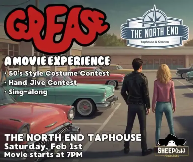 Join us on Saturday, February 1, 2025, at 7:00 PM at the North End Taphouse for an unforgettable evening celebrating the iconic movie Grease. π€β¨ Sing along to your favorite songs with lyrics on the screen, show off your best 50s style in our costume contest (prize for the winner! π), and compete in a lively hand jive competition. πΊπ So, slick back your hair, fluff up your skirts, and get ready for a night of fun under the stars on our giant inflatable screen. π₯ Brought to you by Sheepish Productions, Gulfportβs go-to for fun and immersive experiences! ππ