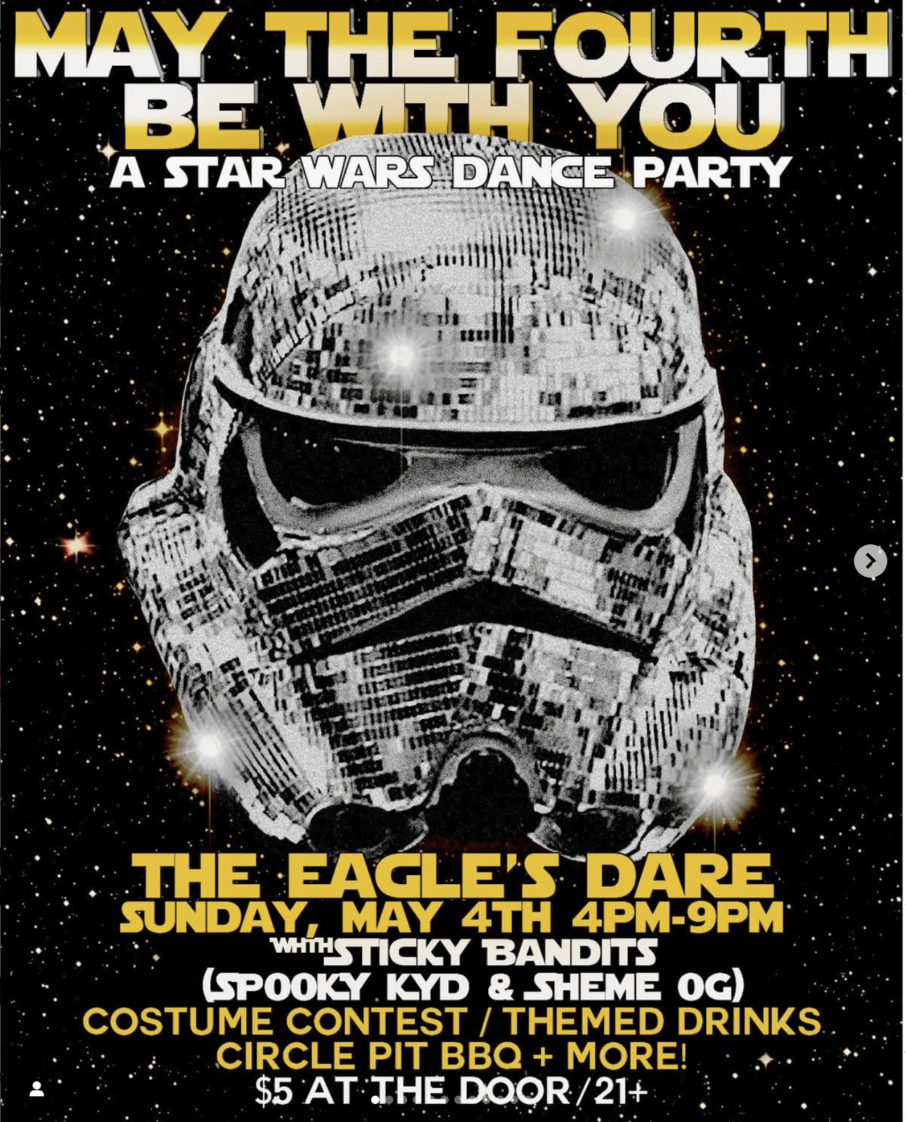 May the Fourth be with YOU! We’re getting closer!! May 4th from 4-9pm over at @theeaglesdare 💫💫💫 We got @stickybandits.wav on the decks, curated drinks at the bar, a very special themed menu from @circlepitbbqnc , interstellar hair tinsel from @sugarfairyhair , special performances, costume contest, and SO MUCH MOREEEEE! Only $5 at the door babyyyy. 21+ please! Tell your friends, tell your family, tell that one neighbor that kinda reminds you of Jar Jar Binks.