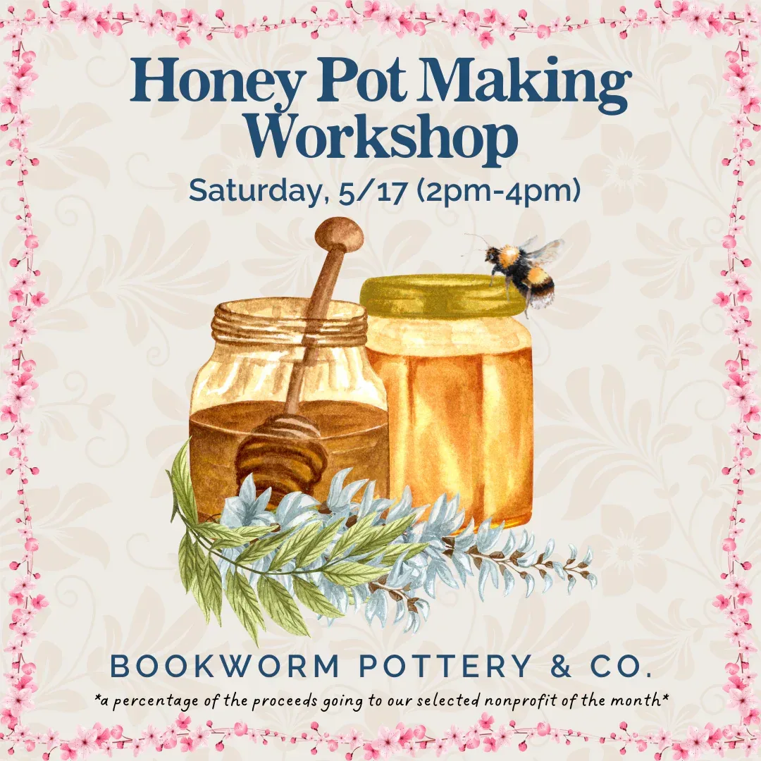 Come enjoy a fun, honey-lovin' class! *A percentage of the proceeds will be donated to our selected local nonprofit of the month: Nourish NC** In this pottery workshop, we’ll create honey pots from scratch that will be perfect for local honey. Come and enjoy a creative outing where you’ll make something cherished for years to come! Our top nearby coffee shop recommendations are Blue Cup Roastery and Folkstone Slow Bar. **This class is NOT on the wheel** Included: personal instruction, clay, tools, supplies, glaze, firings Instructor: Savanna Merklinger of Banaro Design Co. Who: Anyone aged 6 and older When: Saturday, 5/17 (2pm-4pm) Where: Bookworm Pottery - 707 S 16th St, Wilmington, NC 28401 **PLEASE REFER TO OUR PARKING MAP** Cost: $55 per person *The additional photos on this listing (aside from the maps) are of creation examples for inspiration purposes only* Additional Information: Your piece(s) will be glazed with ONE glaze that is intuitively selected by the staff of the studio. It’ll be a fun surprise! Your creations will be ready for pickup from the studio approximately 4-6 weeks from the workshop date. You should receive a pickup email when they're finished, but if it is eaten by filters, please come by the studio after 4 weeks to check on your pots. Any pottery left at the studio 3 months after the workshop date will be donated, so please pick up your work in time! YOU MUST SIGN YOUR POTTERY. Bookworm Pottery & Co. is not liable for lost pieces that are unsigned and mistakenly claimed by another student. Not all pieces are guaranteed to make it out of the kiln if instructions are not followed. Inconsistencies in thickness can cause cracks or even shattering in the firing process. However, the goal is to just have fun, so don’t stress about it! PLEASE NOTE: Tickets cannot be refunded, prorated or exchanged for another workshop due to the special nature of our offerings and very limited enrollment.