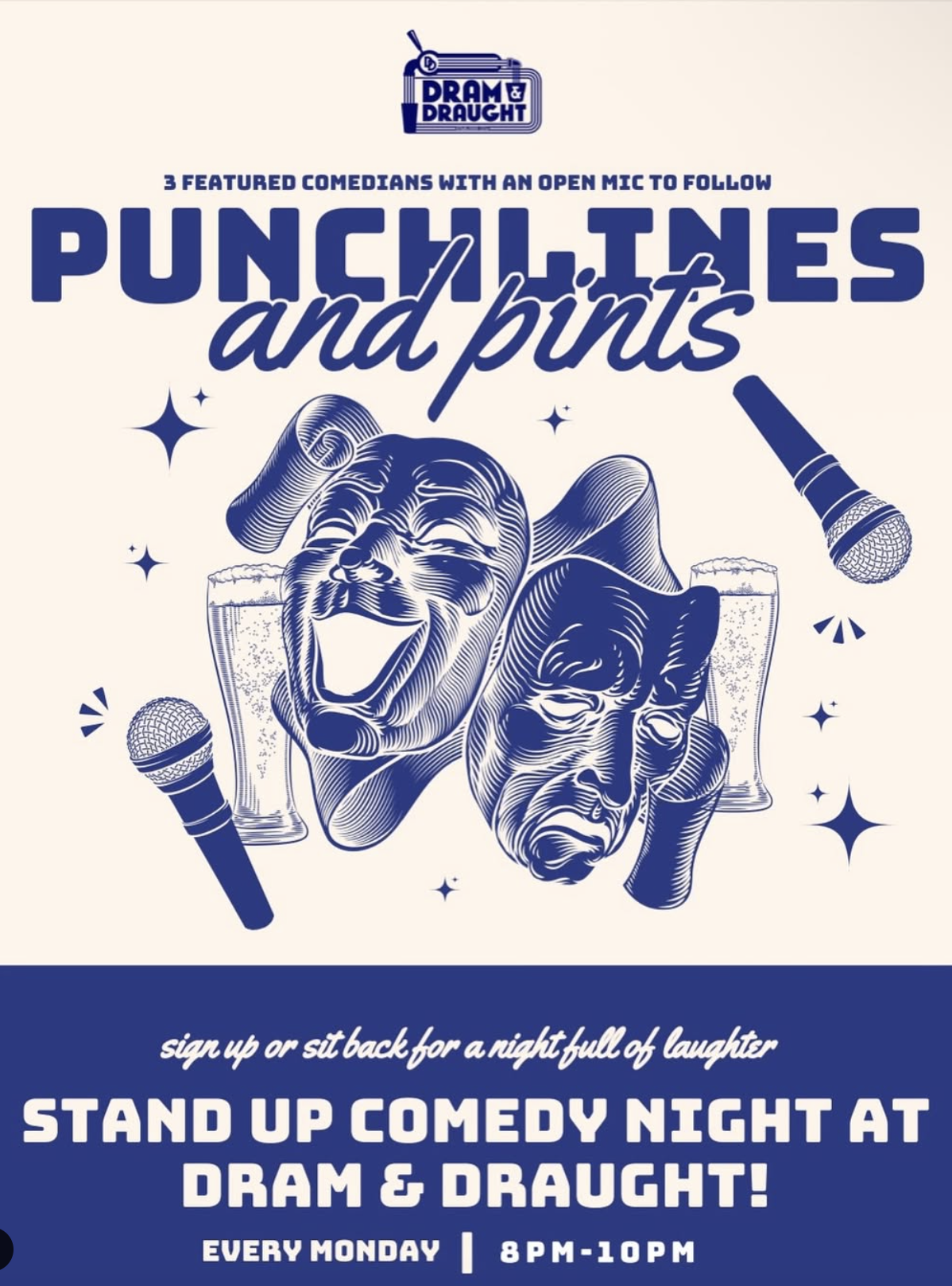 There’s a new open mic every Monday at Dram and Draught starting on the 19th! Punchlines and Pints is going to have 3 feature comics doing 10 minute spots followed by 5 minute sign up spots.