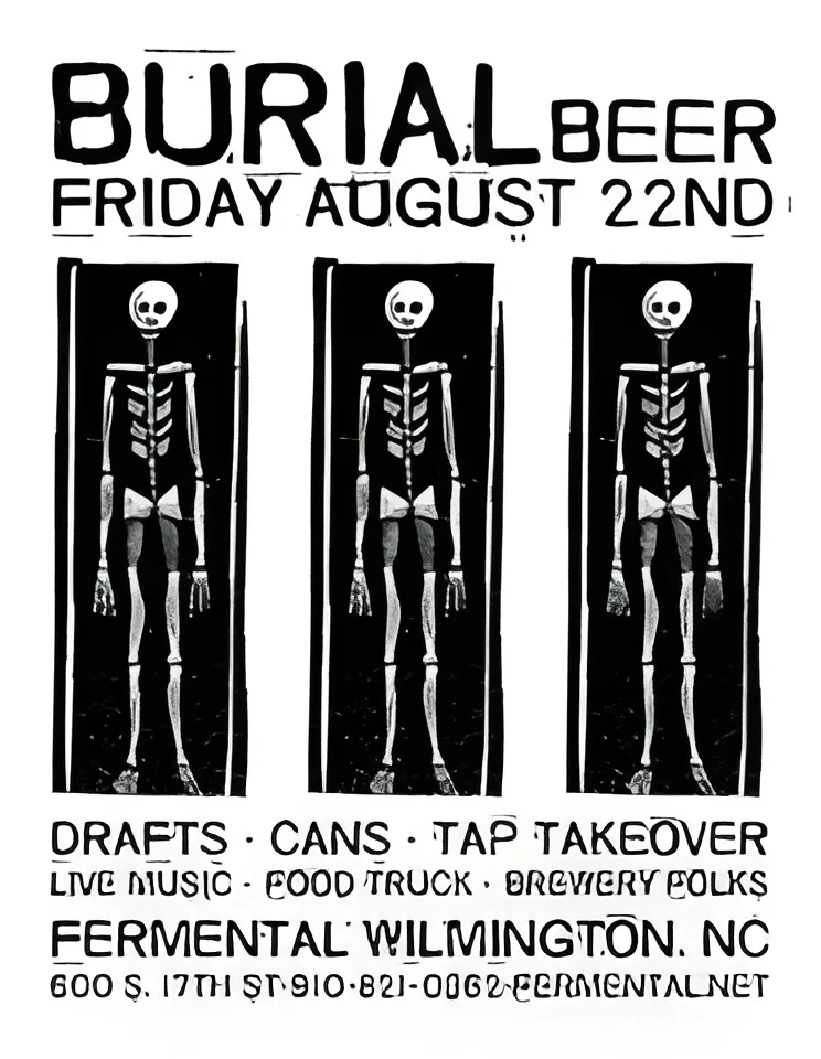 Hello, beer friends. Join the folks at Fermental as we welcome BURIAL BEER CO. of Asheville, North Carolina for a full day of tastings, giveaways, multiple drafts, cans, live music, local food truck, and more FRIDAY, AUGUST 22ND 11AM-11PM Established in 2013, Burial Beer Co. has taken on an important role in the North Carolina beer scene. Crafting bold, creative, American style beers alongside Belgian-inspired ales, Burial Beer Co. maintains a dedication to creativity, tradition, modernization, and preservation. To celebrate Burial Beer Co., Fermental hosts a full tap takeover throughout the day and evening, including limited releases and everyday favorites showcased alongside live music from the MASONBORO SOUND BLUEGRASS BAND and fresh food options from LYNE'S CONCESSIONS Food Truck. Family Friendly. Pet Friendly. FREE Parking is available throughout the Cargo District. FOOD TRUCK: Lyne's Concession [Smash Burgers] 5pm LIVE MUSIC: Masonboro Sound Bluegrass Band 7pm Casual, comfortable, Fermental. Call 910-821-0362 for details.