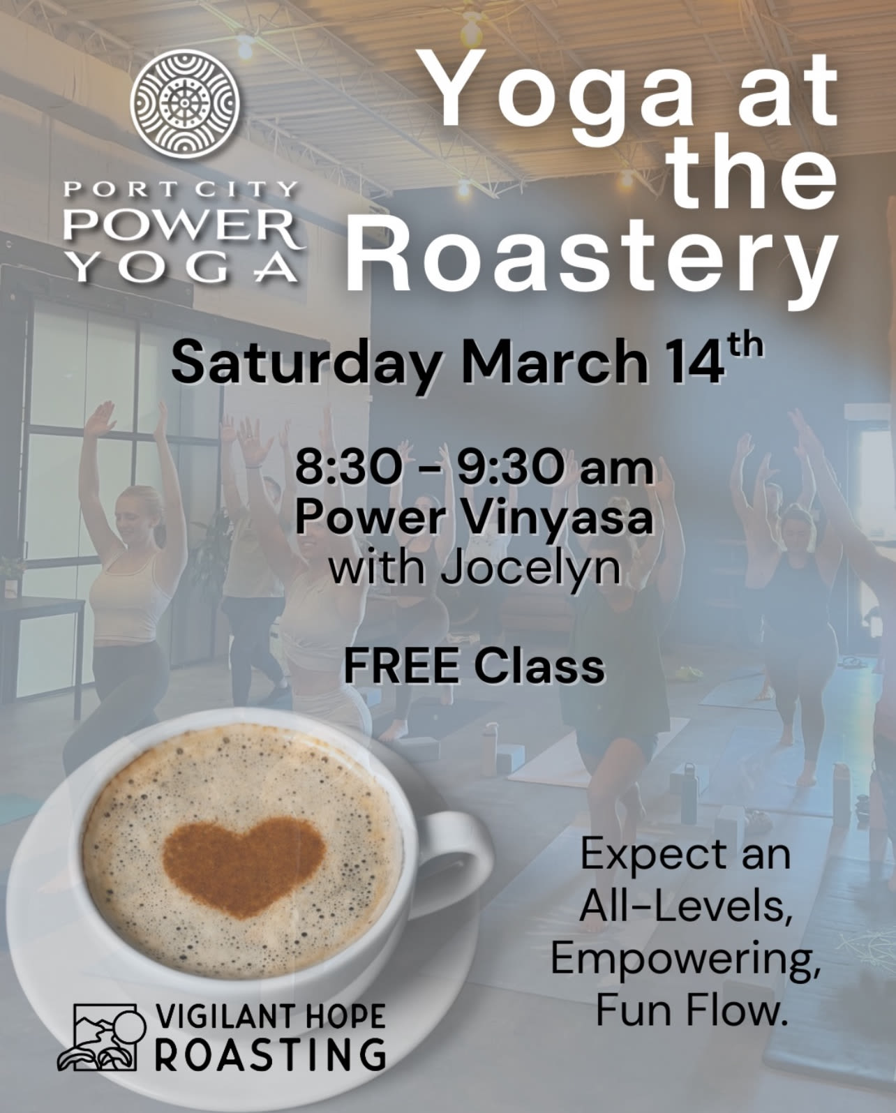 Free yoga class hosted by Port City Power Yoga and Vigilant Hope Roastery. Come for the yoga, stay for the coffee. Held in the back room of the Roastery.