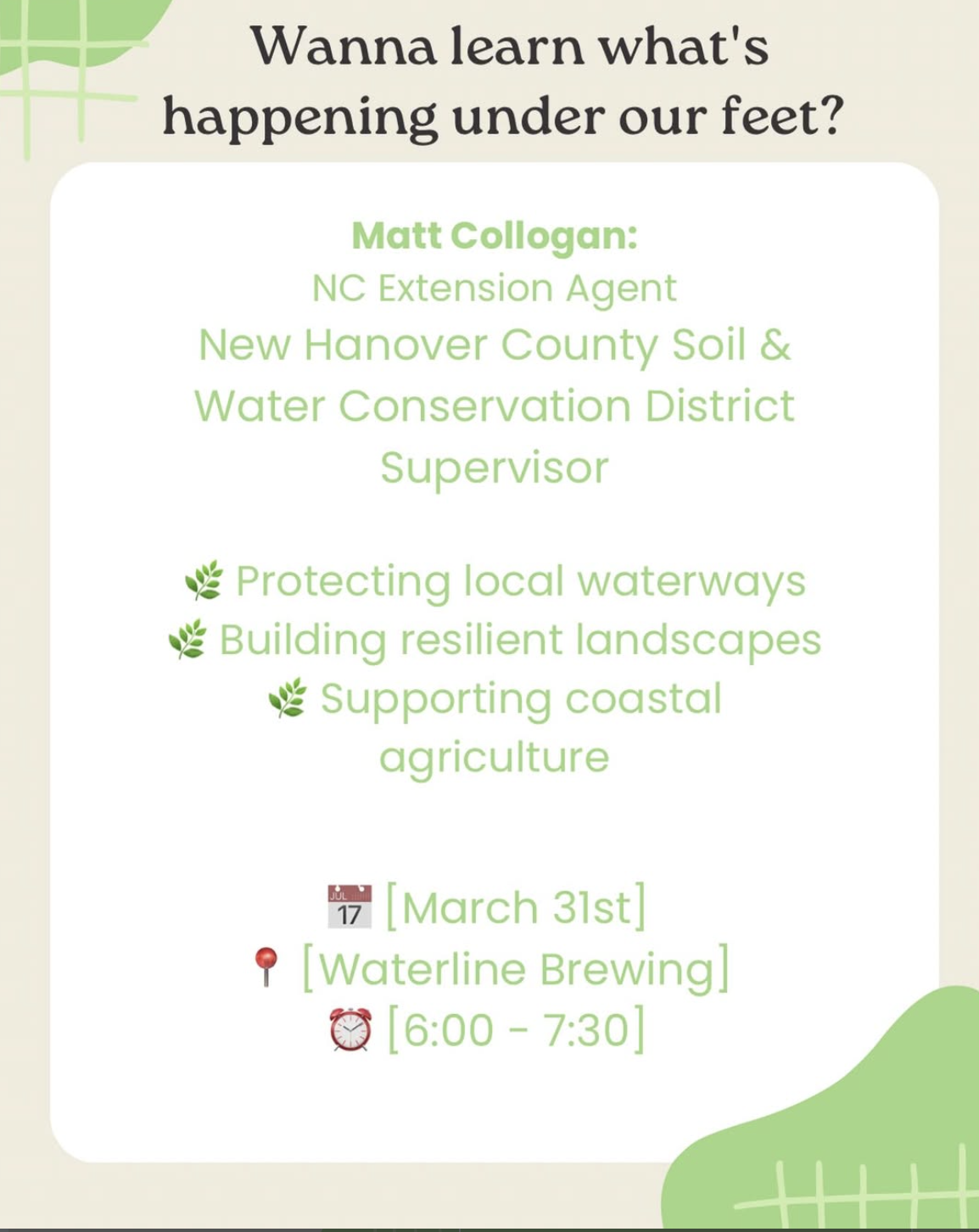 Come learn from Matt Collogan, New Hanover County Soil & Water Conservation District Supervisor as he explains protecting local waterways, building resilient landscapes, and supporting coastal agriculture.