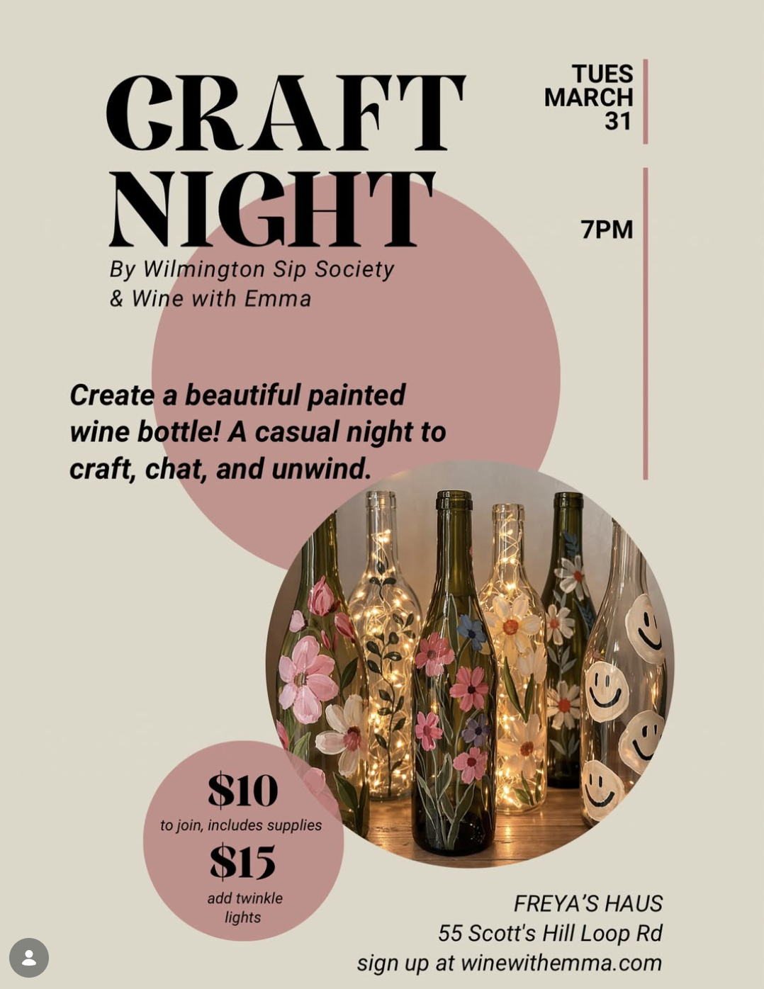 Join us at @freyashaus for a wine bottle painting craft night with Wilmington Sip Society. We’ll have all the supplies ready, so all you need to do is show up with a little inspiration.