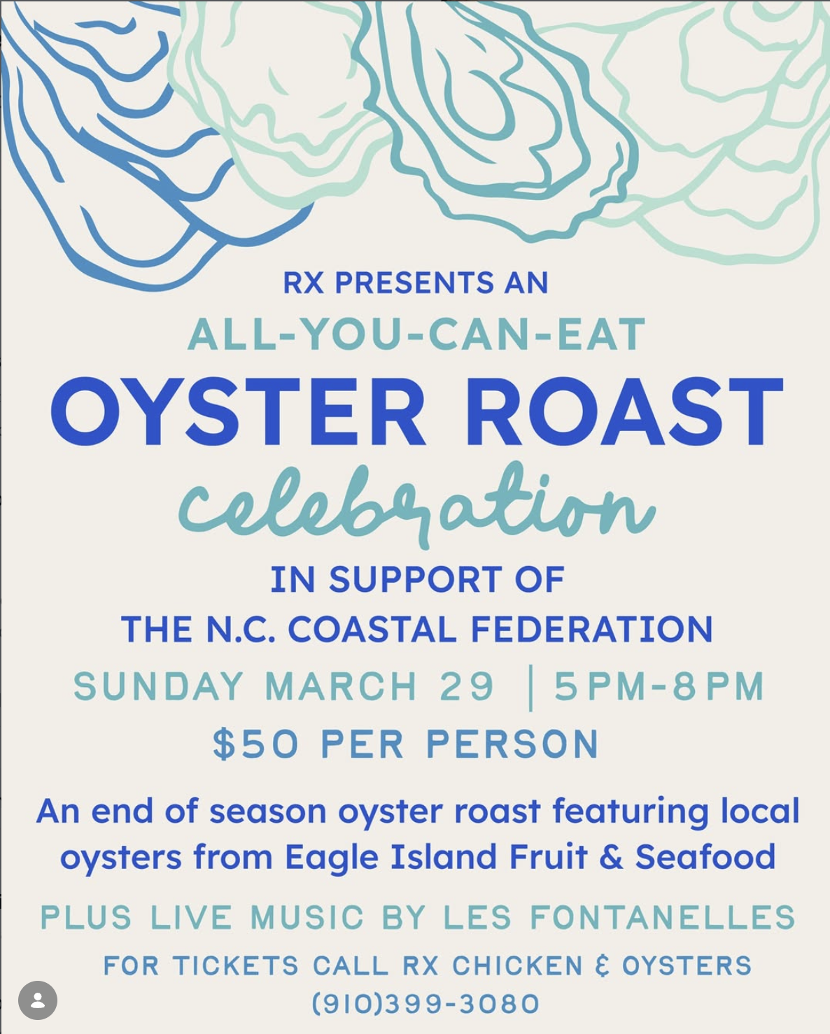 🦪ALL-YOU-CAN-EAT roasted local oysters + music by @lesfontanelles_ilm at Rx, all for a great cause!