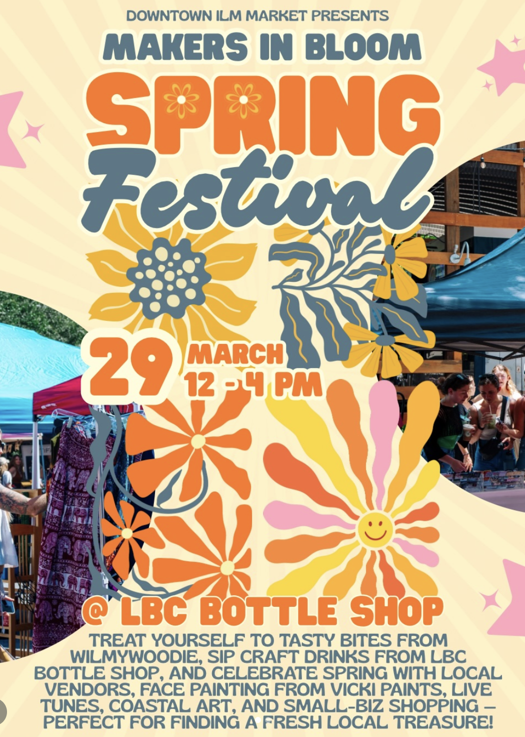 Join us for our Makers in Bloom Spring Festival on March 29 from 12–4 PM at @lbcbottleshop! Think local vendors, coastal art, live tunes, tasty bites from @wilmywoodie, craft drinks, face painting from @vickipaints_xo, and all the good spring energy 🌞🌸