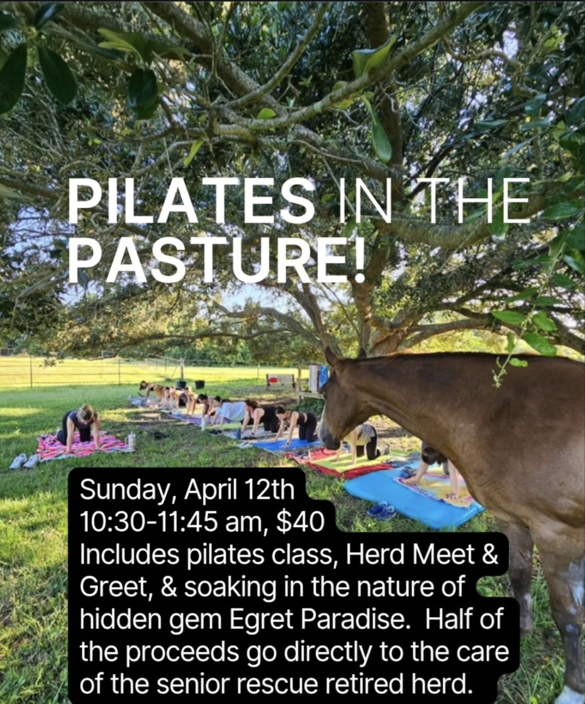 💙 Includes pilates class, Herd of 7 Meet & Greet, photos, water/snack, & soaking in the nature of Egret Paradise - a hidden gem in south Wilmington. Half of the proceeds go directly to the care of the senior rescue herd.
