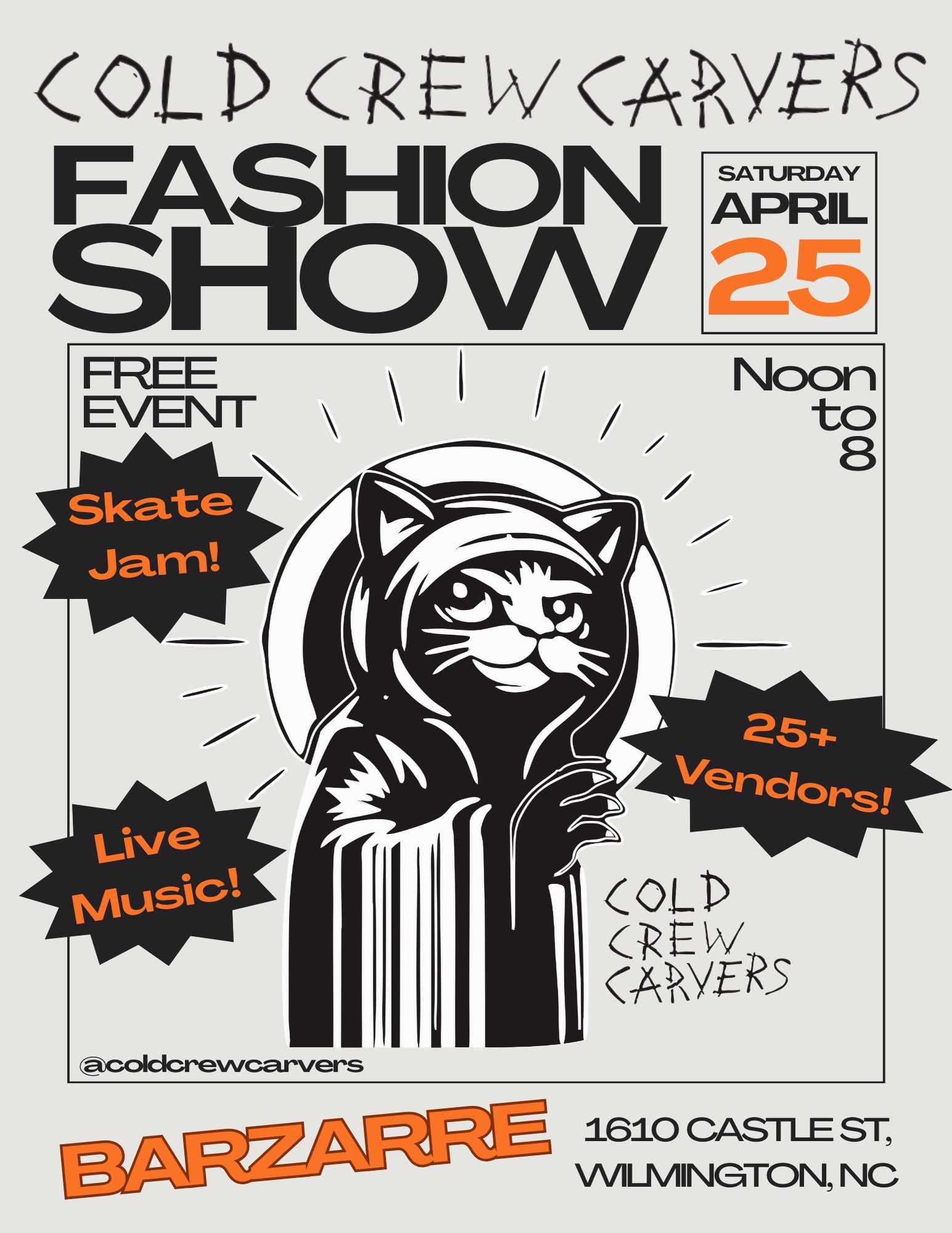 Local skateboarding and streetwear brand COLD Crew Carvers is having its first fashion show and music fest! Over 25 vendors, local bands, and skate jam.