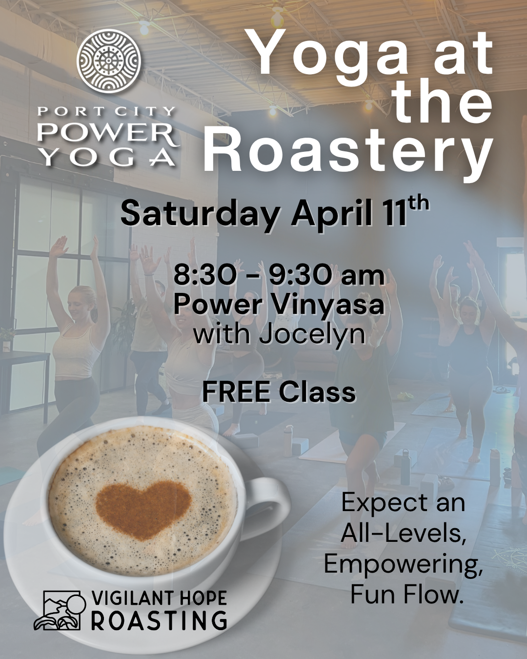 A free yoga class hosted by Port City Power Yoga and Vigilant Hope Roasting. Come for the yoga, stay for a coffee.