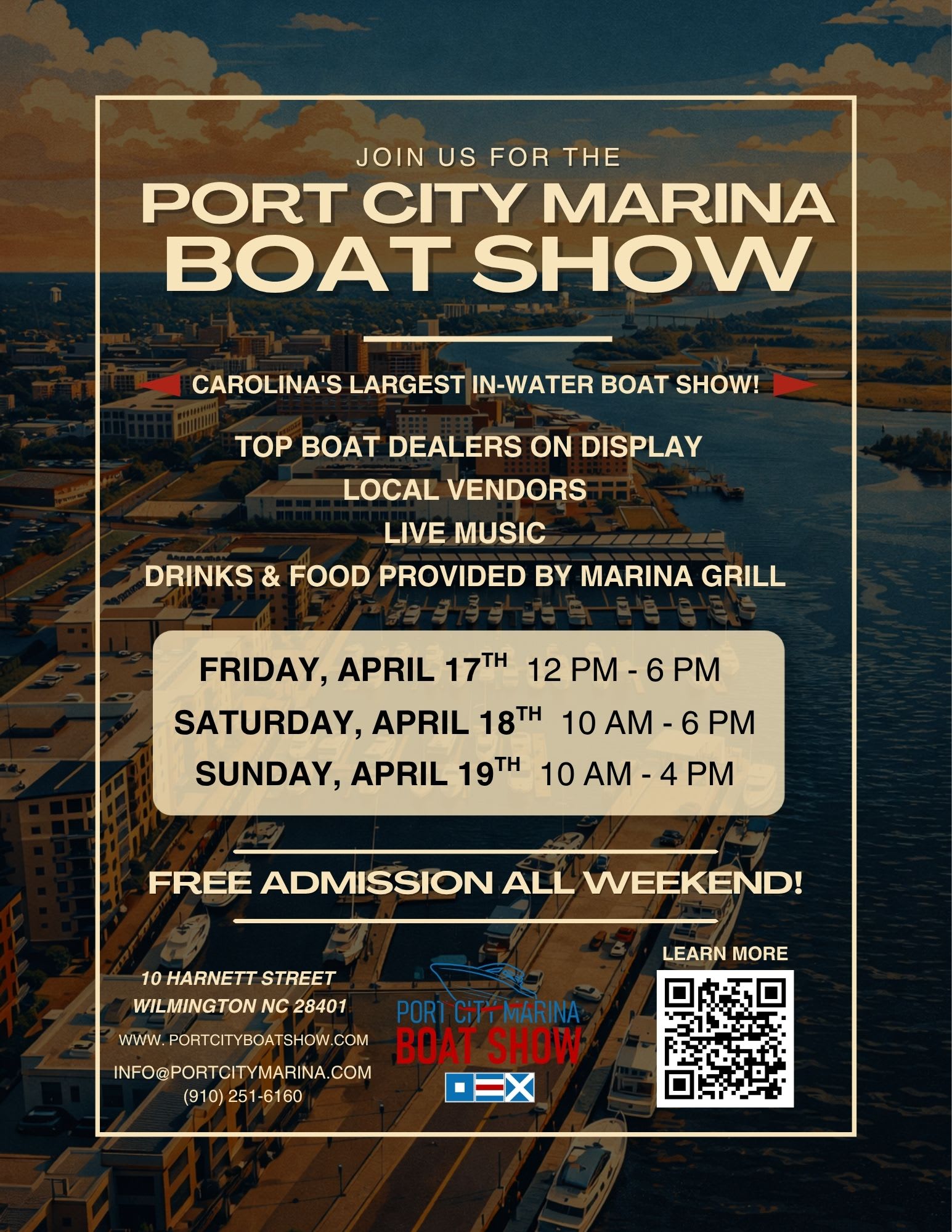 Join us on the Wilmington waterfront for the Port City Boat Show—a weekend filled with boats, music, local vendors, and coastal vibes! Explore a variety of boats on display, connect with marine vendors, and enjoy everything the waterfront has to offer. Whether you’re a seasoned boater or just looking for a fun day by the water, this event has something for everyone. 🌊 What to Expect: Boats on display along the dock Local vendors + marine exhibitors Live music throughout the weekend Food & drinks from Marina Grill Family-friendly atmosphere 📅 Event Dates & Times: Friday, April 17th | 12 PM – 6 PM Saturday, April 18th | 10 AM – 6 PM Sunday, April 19th | 10 AM – 4 PM 🍹 Grab a cocktail, stroll the docks, and soak in the views while checking out the latest in boating and coastal lifestyle. 📍 Location: Marina Grill – Wilmington, NC 🔗 Learn more: www.portcityboatshow.com We can’t wait to see you there!